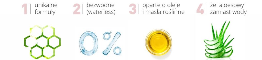Nasze formuły są roślinne, oparte na masłach i maceratach olejowych, bezwodne, wolne od sztucznych konserwantów w 100% naturalne. W naszych produktach znajdziecie Państwo mieszaniny złożonych substancji nie tylko czynnych, ale również biernych, które występują w roślinach. Często składniki towarzyszące podstawowej substancji czynnej (tzw. składniki bierne) wzmacniają, ochraniają i przedłużają działanie innych związków, poprawiają ich wchłanianie i aktywność wywierają również wpływ leczniczy, regulujący i odżywczy. Uważamy, że wydzielanie poszczególnych substancji czynnych nie zawsze jest uzasadnione, dlatego nasze formulacje zawierają cały kompleksy różnych substancji. Ich zdrowotne właściwości są zupełnie inne niż właściwości pojedynczej substancji. Nasza pielęgnacja to idealne połączenie nauki i natury to wiedza ekspercka i wieloletnie doświadczenie.