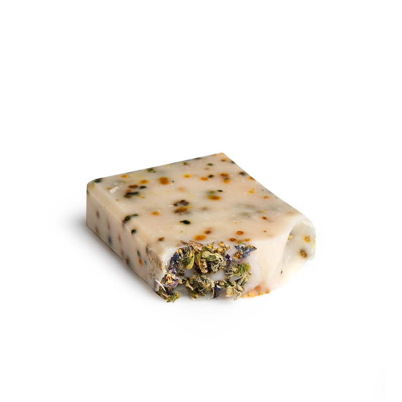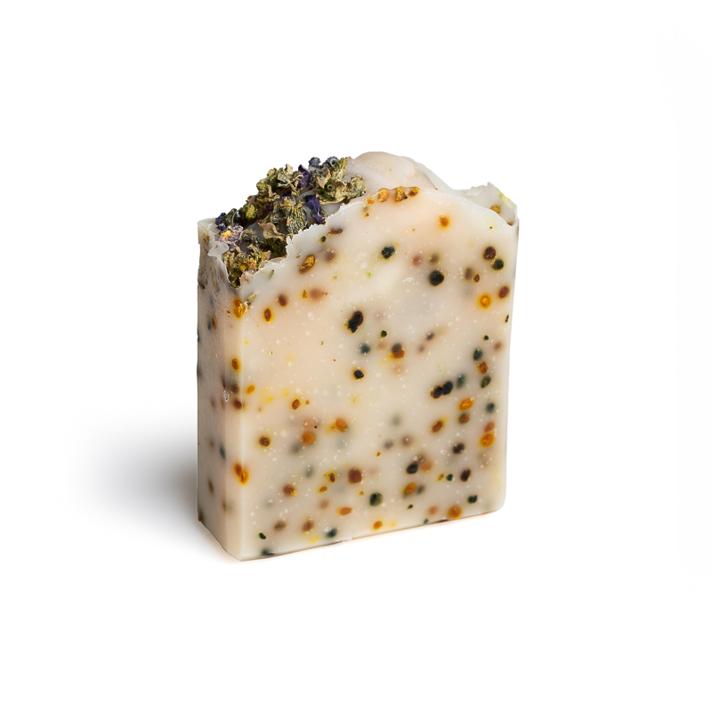 INCI: Olea Europaea (Olive) Fruit Oil, Aqua, Orbignya Oleifera Oil (Babassu Seed Oil), Cocos Nucifera (Coconut) Oil, Oryza Sativa (Rice) Bran Oil, Sodium Hydroxide, Butyrospermum Parkii (Shea Butter), Brassica Campestris Oleifera Oil, Persea Gratissima (Avocado) Oil, Pollen, Viola Tricolor Extract.